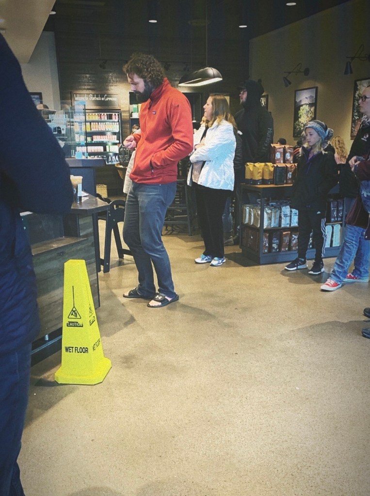 So off to the Starbucks across the street we went. We both had on sandals. It was freezing and wet out.